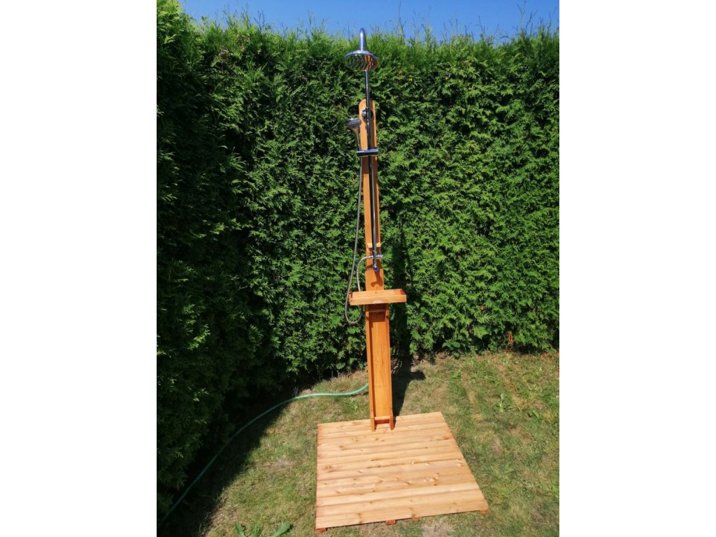 Predovšetkým vďaka drevenej úprave sa hodí ako sprcha na záhradu a skvele splynie s okolitým dreveným nábytkom. Naolejované drevo je odolné proti vlhkosti, plesni a hubám, takže jeho životnosť je skutočne dlhá. Hadica s hlavicou je vyrobená z kvalitnej nerezovej ocele. Výhodou taktiež je, že výšku sprchy si môžete ľubovoľne nastaviť podľa potreby. Drevenú záhradnú sprchu jednoducho pripojíte k vodovodnej sieti a pomocou páky potom regulujete množstvo pretekajúce vody.