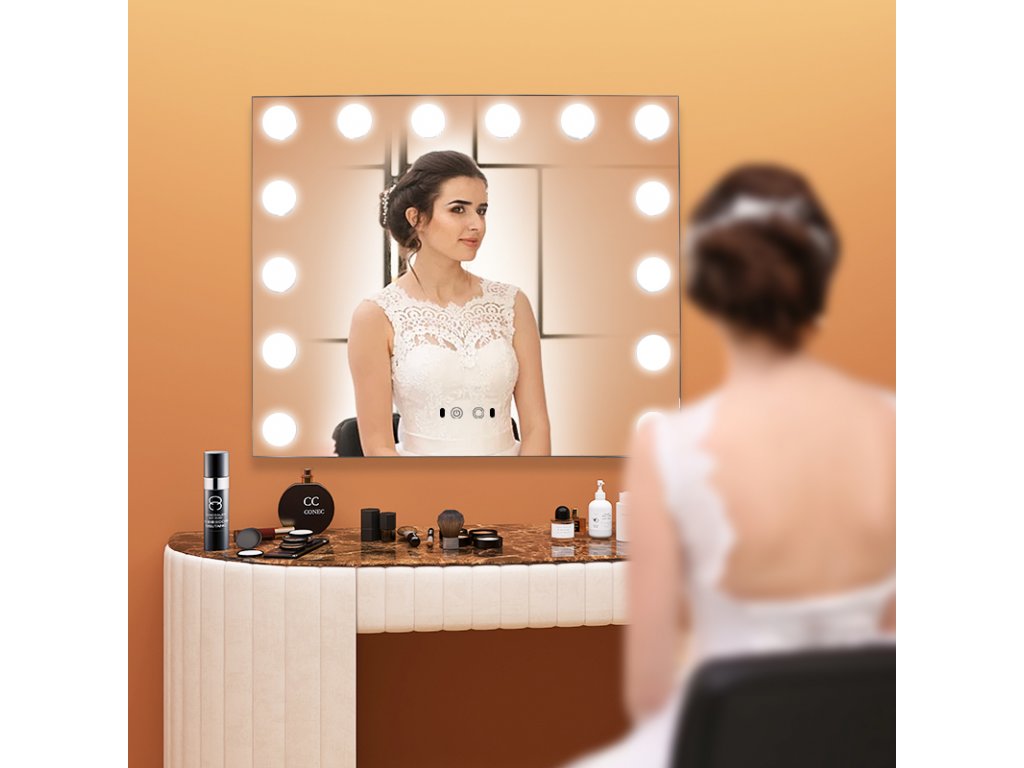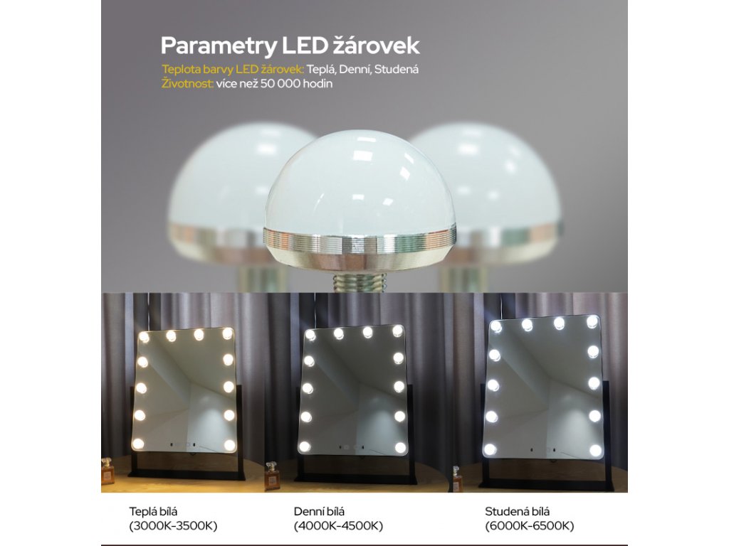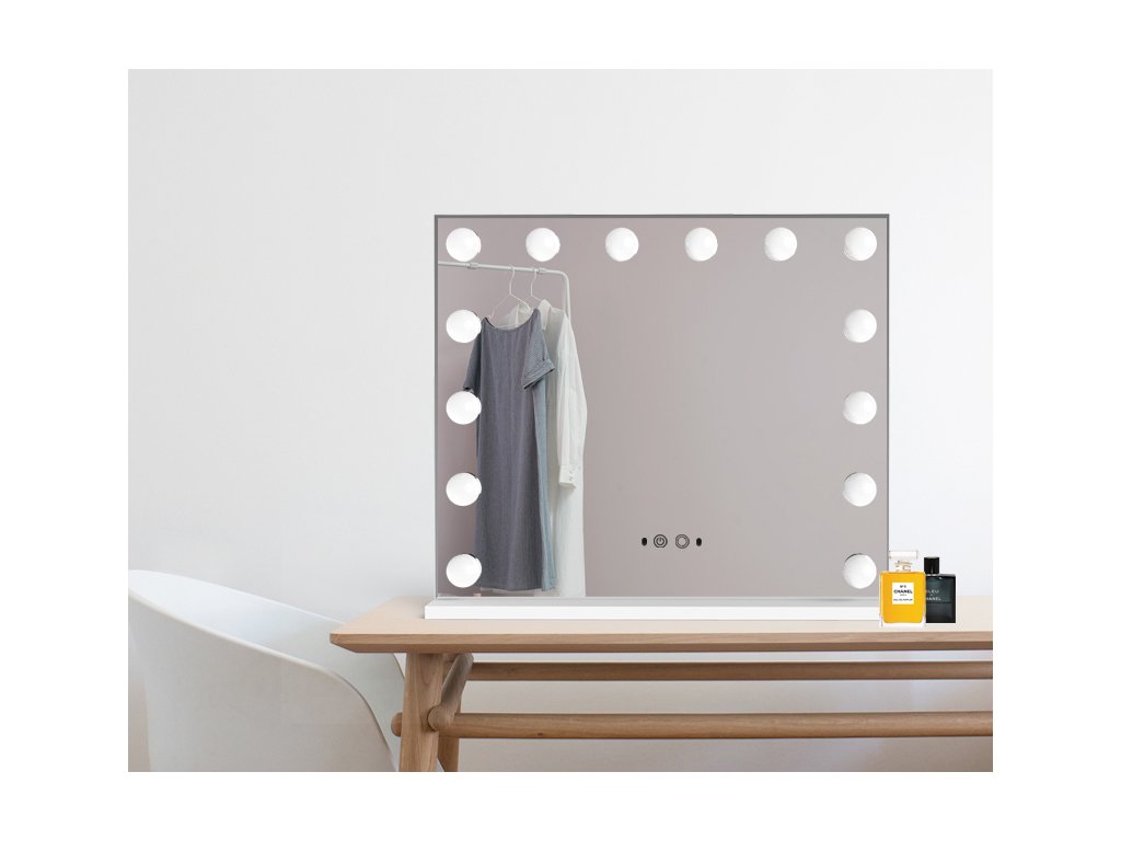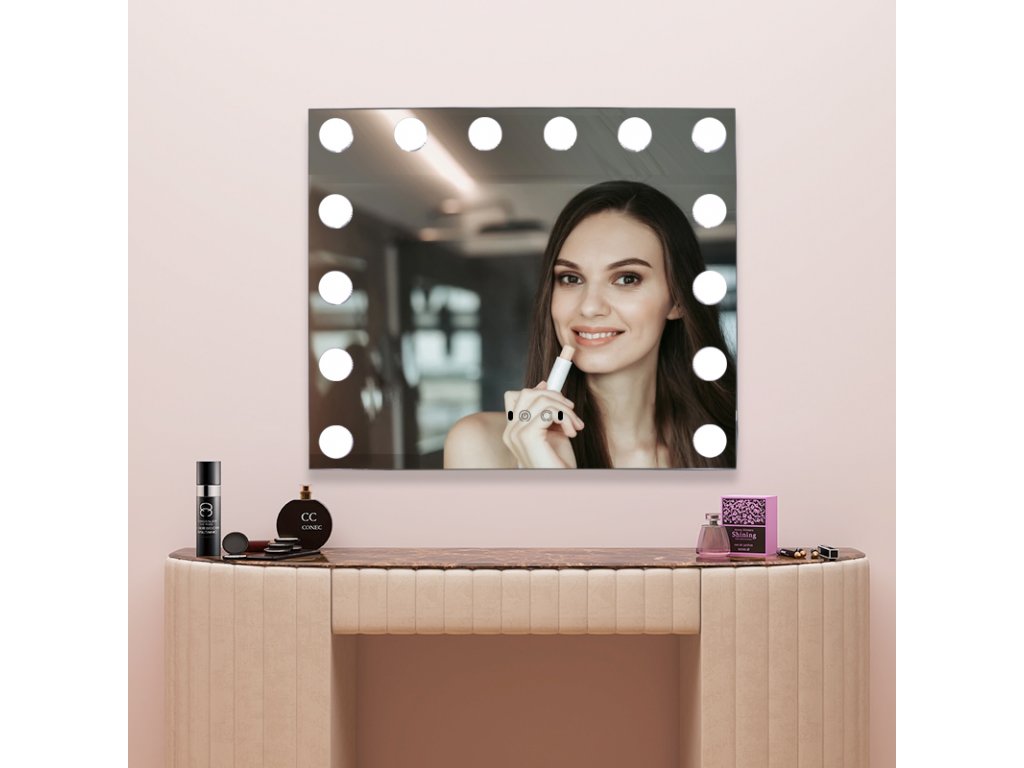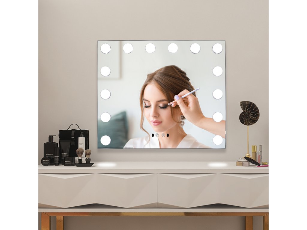 Široké zrkadlo dopĺňa 14 výkonných LED žiaroviek, ktoré nie sú vymeniteľné a poskytujú vysoký svetelný komfort. Dostatok svetla zjednodušuje líčenie aj kozmetické úpravy, vrátane tvarovanie obočia alebo nasadzovanie kontaktných šošoviek, jas možno navyše upraviť pomocou dotykového tlačidla. Druhé tlačidlo slúži pre výber farby svetla, takzvanú teplotu chromatickosti, a voliť je možné z teplej bielej (3000-3500 K), biele (4000-4500 K) alebo studené biele (6000-6500 K). Dokonalé líčenie bude s týmto zrkadlom hračka!