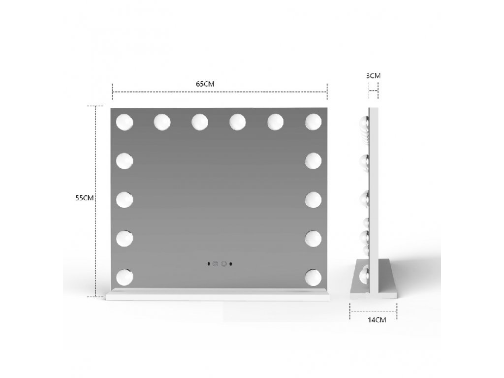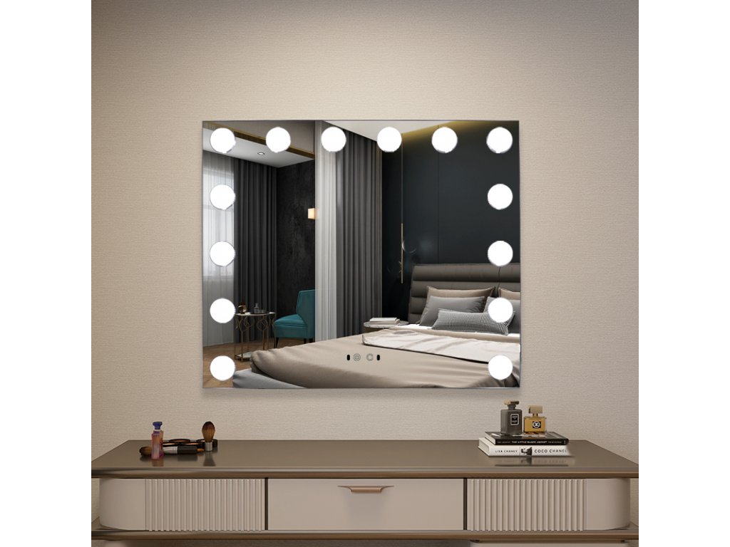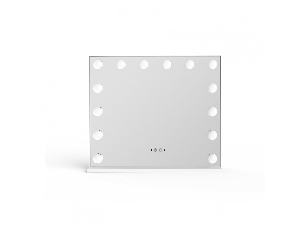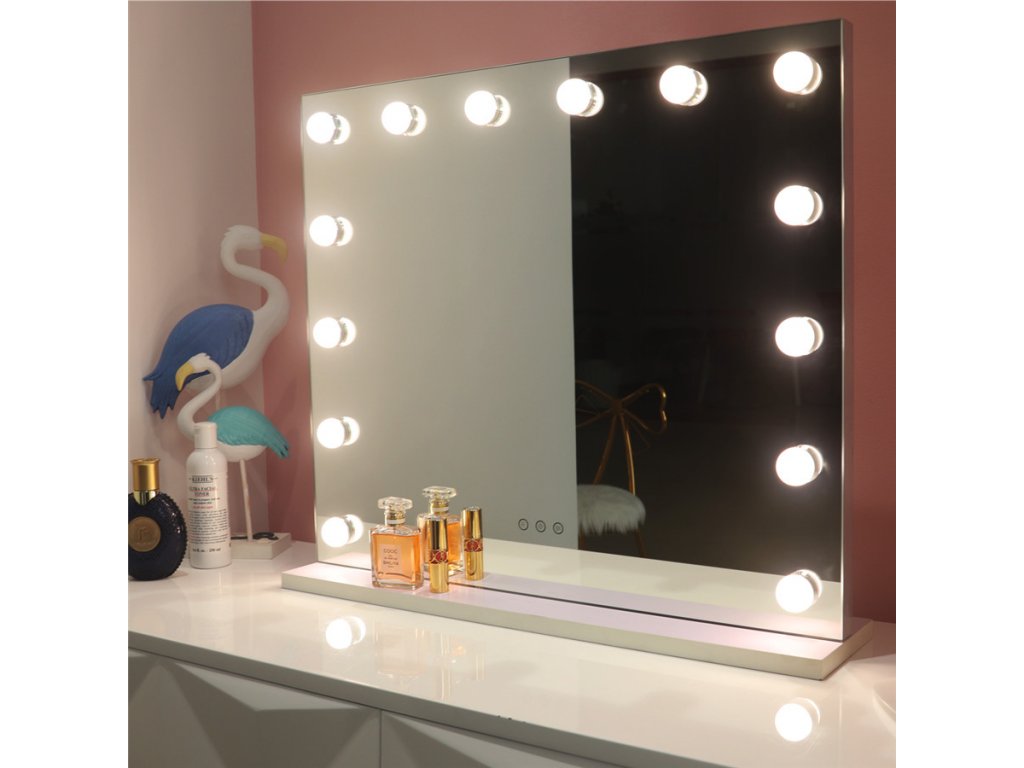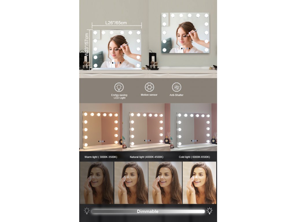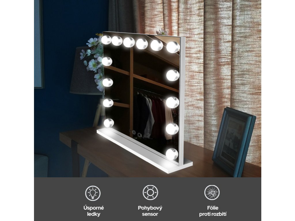 Široké zrkadlo dopĺňa 14 výkonných LED žiaroviek, ktoré nie sú vymeniteľné a poskytujú vysoký svetelný komfort. Dostatok svetla zjednodušuje líčenie aj kozmetické úpravy, vrátane tvarovanie obočia alebo nasadzovanie kontaktných šošoviek, jas možno navyše upraviť pomocou dotykového tlačidla. Druhé tlačidlo slúži pre výber farby svetla, takzvanú teplotu chromatickosti, a voliť je možné z teplej bielej (3000-3500 K), biele (4000-4500 K) alebo studené biele (6000-6500 K). Dokonalé líčenie bude s týmto zrkadlom hračka!